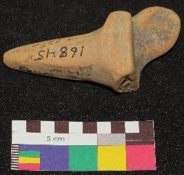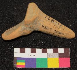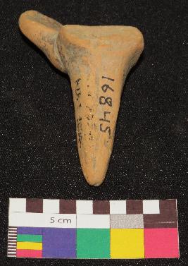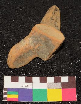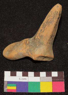 | Description / विवरण | Well fired fragment of terracotta toy cot is in red color, made of well levigated clay, having flat top with pinched corner and conical leg. |