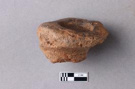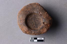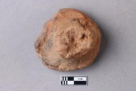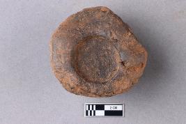 | Description / विवरण | Clay lump bearing an impression of Mahavihara legend in three lines within a circular incuse. A chakra motif is also seen. The script is probably Siddhamatrika. It is yet to be deciphered. A knob at the back is seen. |