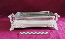 Metal trey with silver like polish on its exterior body having two decorated handles and four legs. The tray is having a hollow at the corner for pouring water and perforation at the center to keep the foods hot. Probably it is stream hot pot.