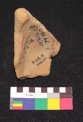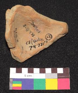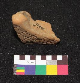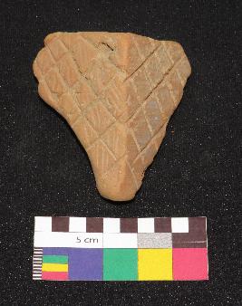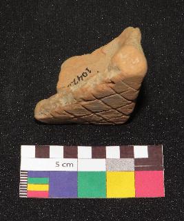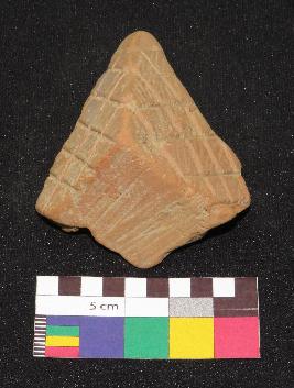 | Description / विवरण | Decorated fragment of well fired, red color terracotta cart frame, is made of well levigated clay, having probably rectangular shape, smooth body and flat base with vertical line impression. It has incised design in criss -cross pattern on outer part of sides. |