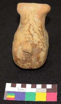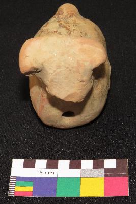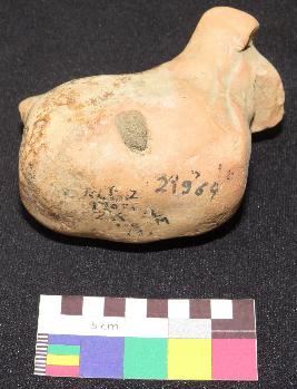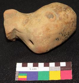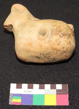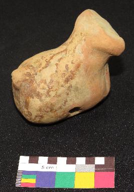 | Description / विवरण | Well fired, terracotta animal figure is dull red in color, made of well levigated clay, having twisted ears, face, small neck, long body, and a small tail. Figure is defaced, it does not have any facial features and legs are missing. It also has three holes, two on either sides of stomach and one is on chest. |