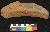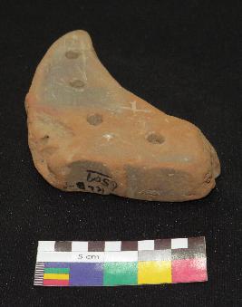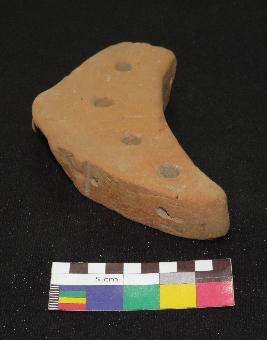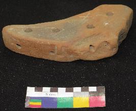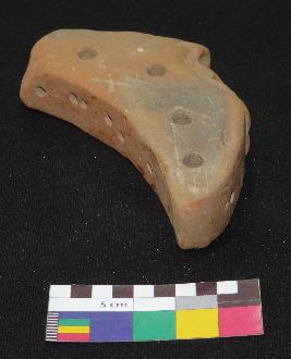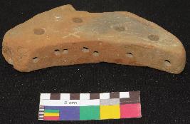 Well fired, red color, thick fragment of curved portion of terracotta toy cart frame, made of well levigated clay, having smooth body, four perforations on side and seven holes on the concave top.