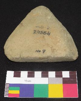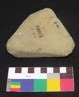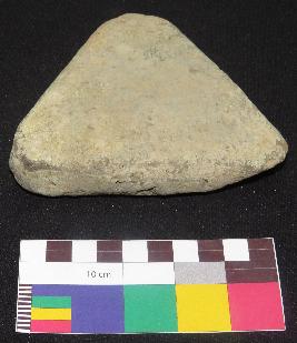 | Description / विवरण | Thick, triangular shaped, terracotta cake is dull red in color, made of semi coarse material, having rough surfaces and, one tip is sharp and thin. |