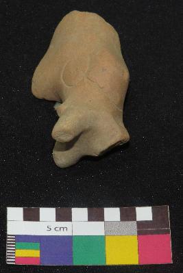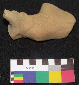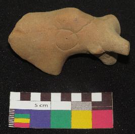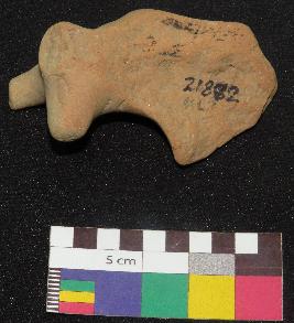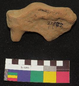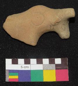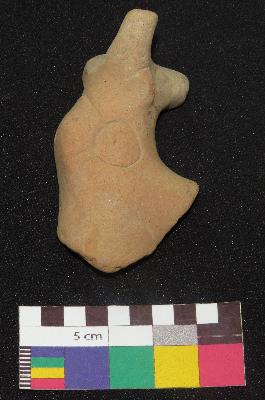| Description / विवरण | Well fired, fragment of dull red color terracotta bull, is made of well levigated clay, having front turned circular horn, below the horn a ear, long face , incised oval shaped eyes, curved neck and a hump. The hump has a incised circle with a pin hole in it and a curved line on the top of hump which is joining the circle |