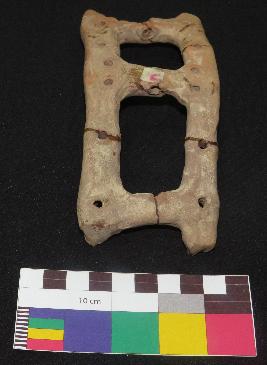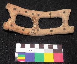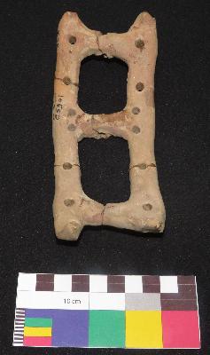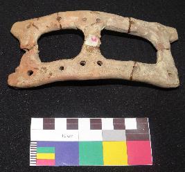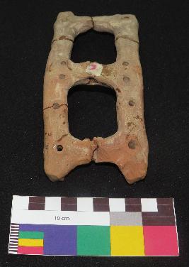 | Description / विवरण | Well fired, rectangular shaped, terracotta toy cart frame is red in color and made of well levigated clay. It is having two larges parallel sides and three small. The large sides are curved and have six holes on each. there is a horizontal perforation on the two short sides. |