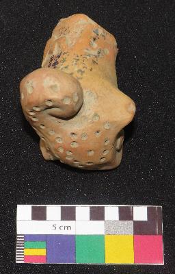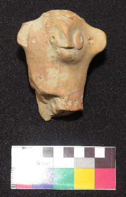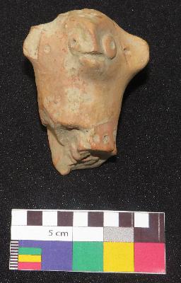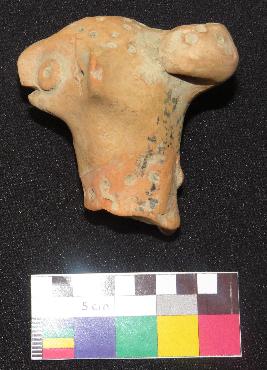 | Description / विवरण | Well fired, dull red color, head of terracotta animal figure is made of well levigated clay, having pinched ears with pin size hole, face with pinched nose, button eyes with small hole, open mouth, long neck and a twisted stylized head tail. The head tail has a perforated design. The figure has a hole at neck. |