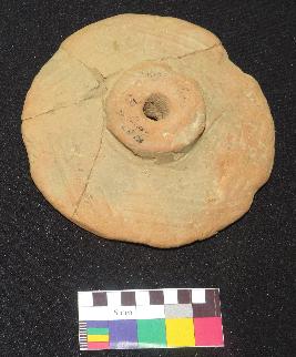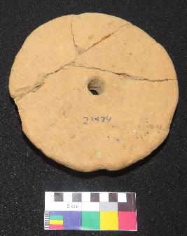 | Description / विवरण | Well fired, medium size, decorated terracotta wheel is in dull red color, made of well levigated clay and circular in shape with perforated flat round knob in the center. Both the surfaces are slightly rough. One side have embossed line design in group of five, each group having three set of lines which are intersecting with other groups. Other side is flat. |