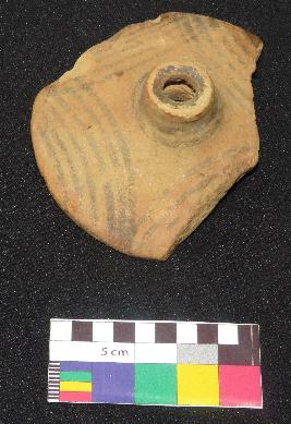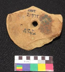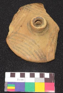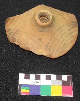 | Description / विवरण | Well fired, medium size, thin painted terracotta wheel is in dull red color, made of well levigated clay and circular in shape with perforated round knob in the center. One side smooth and have painting in black color on red surface. The painting is in group of four inverted curved line, each group have six set of lines and two concentric circle around the knob. Other side is slightly rough and flat. |