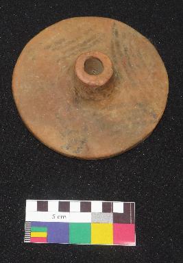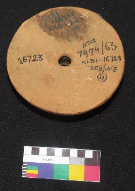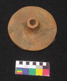 | Description / विवरण | Well fired, medium size painted terracotta wheel is in red color, made of well levigated clay and in circular shape having knob with perforation. The upper surface is smooth and having painting in black color on red surface. It is line painting having four groups of five inverted turned curved lines and two concentric circles around the knob. The other surface is slightly rough. |