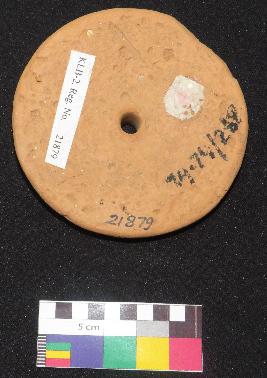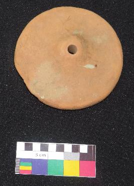 | Description / विवरण | Well fired, medium size terracotta wheel is in red color, made of well levigated clay and in circular shape having upper surface smooth with a small perforated knob in center and other surface is rough with many small holes. |