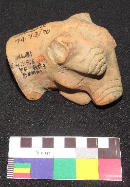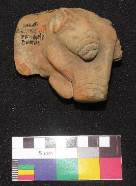 | Description / विवरण | Medium fired, red color, head of terracotta bull is made of well levigated clay, having broken horns, ears, protruded eyes elongated face and long neck. It has design in curved line pattern around the nose in. |