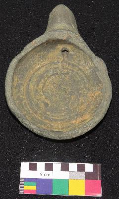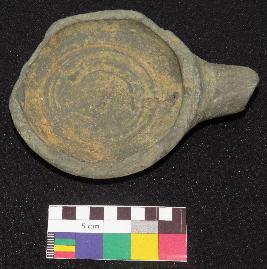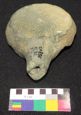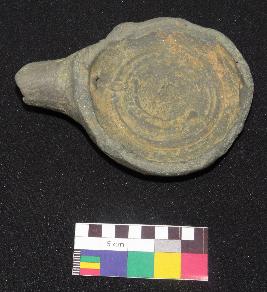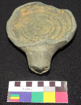 | Description / विवरण | Well fired, blackish color, fragment of terracotta feeding cup, is made of well levigated clay having broken cup with circular flat base and a spout with hole. The inner part of cup has design in concentric circle pattern and base also impression in circular pattern. |