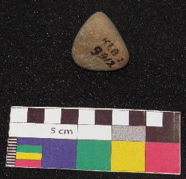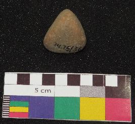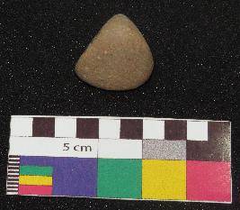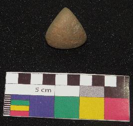 | Description / विवरण | Small size, triangular shaped terracotta gamesman is in dull red color, made of well levigated clay having smooth and plain sides, blunt edges and finely made. |