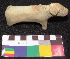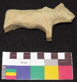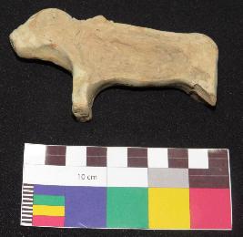 | Description / विवरण | Well fired, dull red color, broken decorated terracotta bull is made of well levigated clay, having broken horn, elongated face, incised drop shape eyes with a straight line inside it, nostrils, closed mouth, neck, elongated body, prominent hump on the back and joint legs. It has incised pattern design in three circular lines around the long face and four incised line around the neck. |