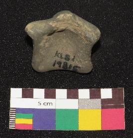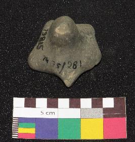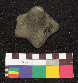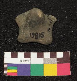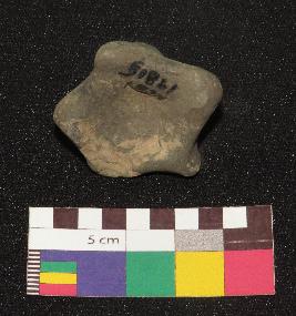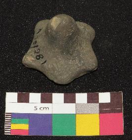 | Description / विवरण | Blackish color, terracotta gamesman is made of well levigated clay having thick broken knob, plain body and shallow base with five foots. |