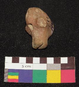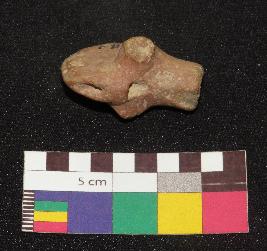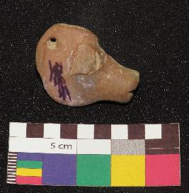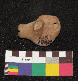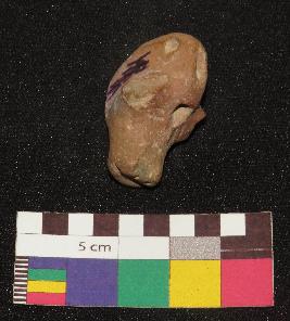 | Description / विवरण | Well fired, brownish color, head of terracotta animal figure is made of well levigated clay having broken ears, elongated face, incised eyes, and closed mouth. It has holes one on forehead and other rat the back of head. |