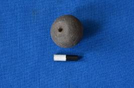 | Description / विवरण | An Areca nut shaped bead of terracotta in black colour with striation marks on the surface and a perforation at the center. |