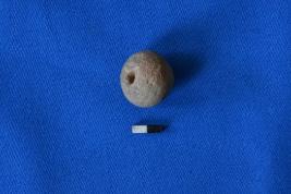 | Description / विवरण | Arecanut shaped bead of terracotta in red ware with striation marks on the surface and a perforation at the center. |