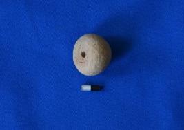 | Description / विवरण | Areca nut shaped bead of terracotta in red ware with a smooth surface and a perforation at the center. |