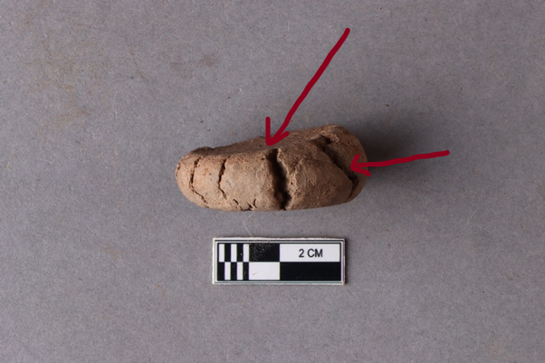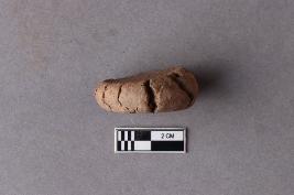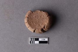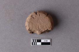 A partially broken circular clay lump bearing a three-line worn-out inscription within a circular incuse, the upper portion is missing.