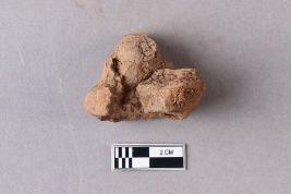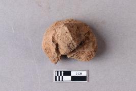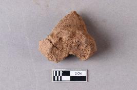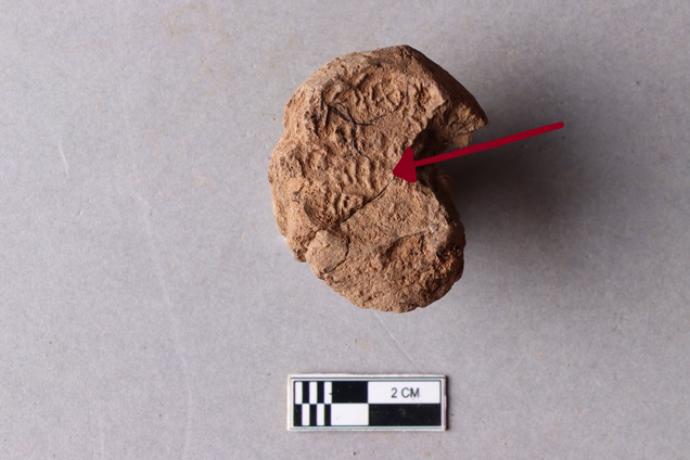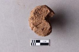 Fragment of clay lump bearing an impression of the undeciphered partially available Mahavihara legend with chakra and deer motifs, the right portion is broken and missing.