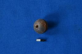 | Description / विवरण | An arecanut shaped bead of terracotta with black marks because of firing and also has striation marks on the surface with a perforation at the center. |