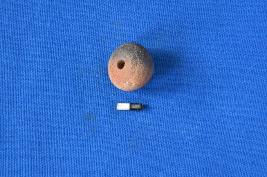 | Description / विवरण | An arecanut shaped bead of terracotta with shades of red and black because of firing, striation marks on the surface and a perforation at the center. |
