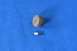 | Description / विवरण | An arecanut shaped bead of terracotta in black colour with a flat top and roundish at the bottom. It has a smooth surface and perforation at the center. |