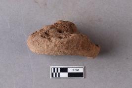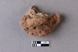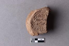 | Description / विवरण | A broken clay lump bearing an impression of the Mahavihara legend in a two-line inscription in the Siddhamatrika script. Some alphabets have weathered and it remains undeciphered. The chakra with deer motif and lotus flower motif is also seen. The right side portion is broken and missing. |