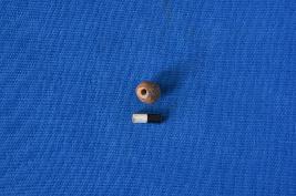 | Description / विवरण | A short cylindrical shaped bead of ivory with an orange and black coloured smooth surface and perforation at the center. |