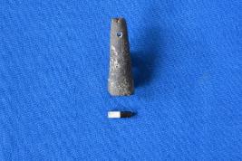 | Description / विवरण | A cylindrical shaped pendant of terracotta in black colour with tapering sides, flat circular base and transverse perforation near the top. |