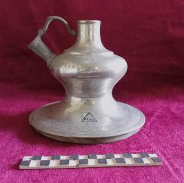 Silver white metallic water base pot with channel of Hukka. The body and neck portion is beautifully decorated with floral design. A spout and handle is attached at the belly part of the Hukka.