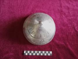 A silver lid with a inscription. Metalic floral decorated lid with a knob at the top. On its three sides on top surface birds are seen on a round floral shaped design and on the body part inscription is written as Sarkar Asif Qadar Bahadur in Urdu.
