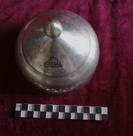 Dome shaped lid and inscription is written as Nawab Asif Qadar Syad Wasif Ali Meerza Bahadur at the body part of the lid.