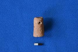 | Description / विवरण | A cylindrical shaped pendant of terracotta in red ware with tapering sides, flat circular base, depression at the top and a transverse perforation near the upper portion. |