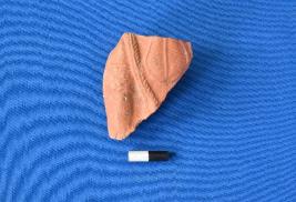 | Description / विवरण | Fragment of a female figurine, double moulded, portion of upper left back, showing stylized hair-do of leaf-shape, cross belt running across the left shoulder, coiled armlet in the left arm. |
