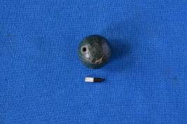 | Description / विवरण | A circular shaped bead of green jasper with a polished and slightly chipped surface, it has a perforation at the center. |