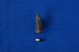 | Description / विवरण | A conical shaped pendant of terracotta in black colour with a flat circular base, a transverse perforation near the top and has a smooth surface. |