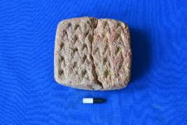 | Description / विवरण | A square shaped skin rubber of terracotta in red ware with V shaped incised designs on its rough surface. |