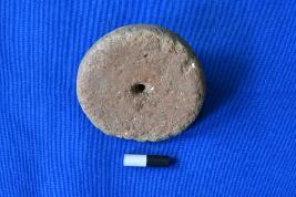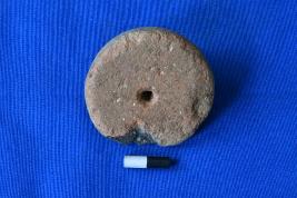 | Description / विवरण | A circular shaped wheel of terracotta in red ware with a perforation in the center, a smooth surface, but it is damaged from one side near the edge appearing black in colour. |
