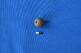 | Description / विवरण | A small arecanut shaped bead of terracotta in red and black colour with a smooth surface, a flattish top, a medium coarse fabric and a perforation at the center. |