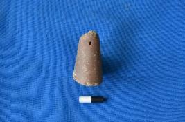 | Description / विवरण | A cylindrical shaped pendant of terracotta in red ware having a small perforation done transversely near the apex, the surface is smooth and has a flat circular base and also has an oblique breakage at the top. |