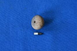 | Description / विवरण | An arecanut shaped bead of terracotta in shades of grey and red with a smooth surface and perforation at the center. |