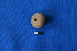 | Description / विवरण | Arecanut shaped bead of terracotta in black and red colour with striation marks on surface and a perforation at the center. |