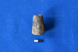 | Description / विवरण | A cylindrical shaped gamesman of terracotta in black colour with tapering side and flat circular base. |