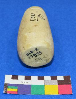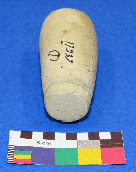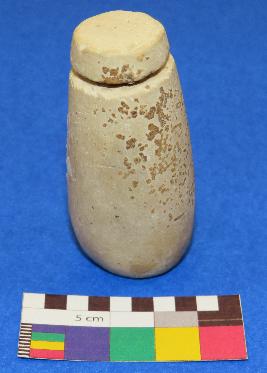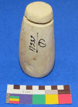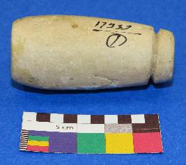 | Description / विवरण | Barrel shaped, weight stone used for weighting materials is whitish in color, having smooth surface, circular section, flat circular button top, deep groove mark on neck, long body, and flat circular base. |