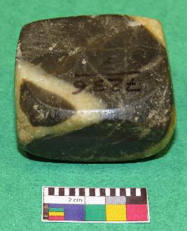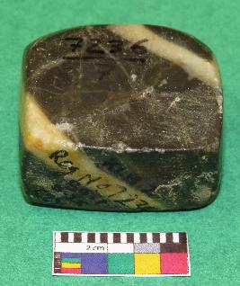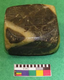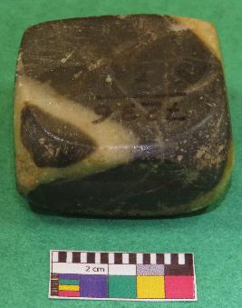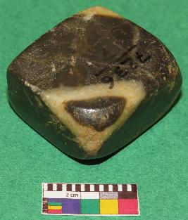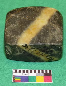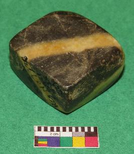 | Description / विवरण | Cuboid shaped, weight stone used for weighting materials is black in color having yellow color bands, smooth surface, rectangular section, rectangular sides, upper and lower surface are almost in square shape. |