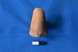 | Description / विवरण | A conical shaped gamesman of terracotta in red ware with spots of black, a depression at the top and smooth surface. |