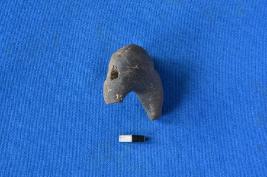 | Description / विवरण | A broken terracotta nandipada shaped pendant in red ware with transverse perforation on the top portion. |