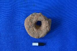 | Description / विवरण | A wheel of terracotta in red ware with a rough surface, breakage at the edge and a hole in the center. |